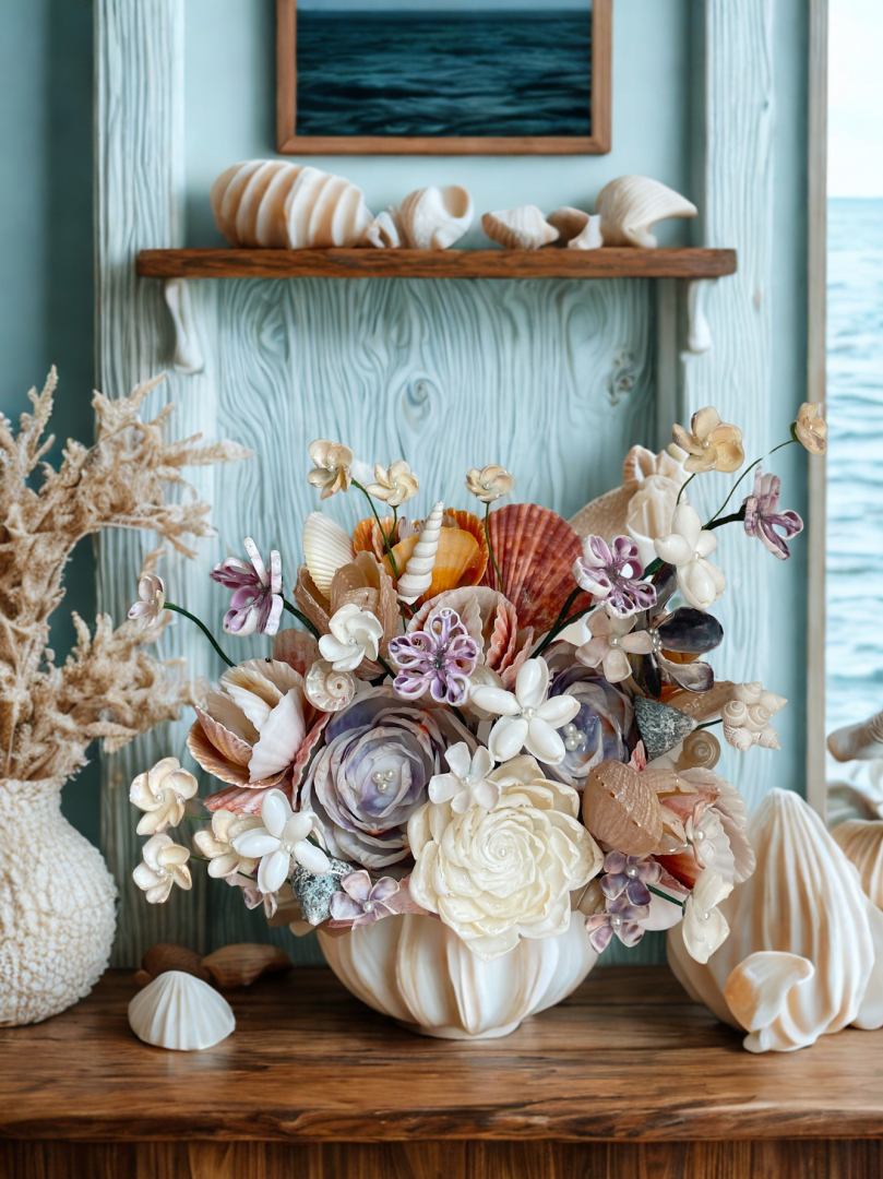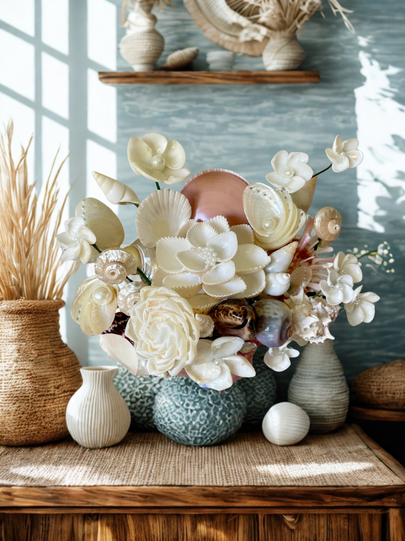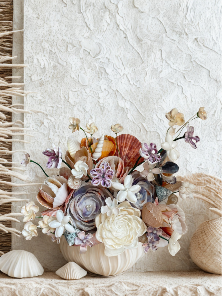These installations begin with one of my handmade shell bouquets, created specifically for your home. Scale, tone, and placement are carefully considered so the piece feels natural to the surroundings while still creating a feel of bespoke coastal luxury.